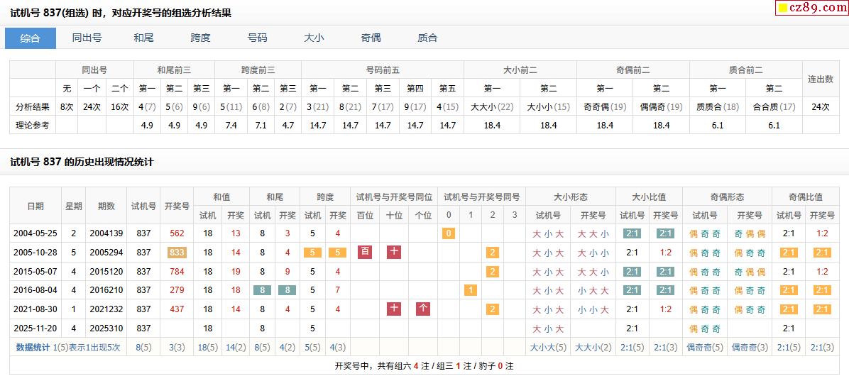 310期福彩3D试机号837对应开奖号的组选分析结果